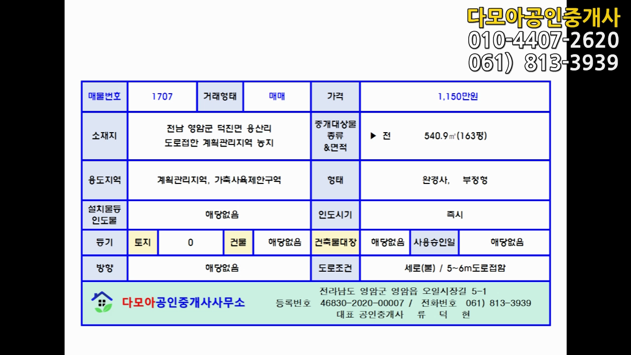 (매물번호1707) 영암군 덕진면 용산리 용산보건진료소인근 계획관리지역 163평 농지
